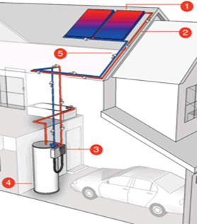 | Solarni sistemi Nudimo Vam izdelke priznanega nemškega proizvajalca Sonnenkraft na trgu solarne tehnike in obnovljivih virov energije Sonnenkraft, ki že leta razvija kompakten in visoko tehnološke solarne sisteme. Vrhunske rešitve bodo učinkovito znižale vaše stroške ogrevanja in popolnoma zadostile potrebam po topli vodi med majem in septembrom. Visoko tehnološke in kvalitetne rešitve so primerne za vse vrste objektov. Solarni sistemi Sonnenkraft Sončni kolektorji (1) Solarni sistemi pretvarjajo sončno energijo v uporabno toploto. Za naše kraje je povprečna sončna moč 800 W/m2. V solarnih kolektorjih se mešanica vode in glikola (t.j. prenosnik toplote) segrevata in krožita po ceveh med solarnimi kolektorji in solarnim zalogovnikom v katerem se topla voda potem shranjuje. (2) Na solarnem zalogovniku je elektronski krmilnik, ki vedno spremlja temperaturo v solarnih korektorjih in solarnem zalogovniku. V kolikor je temperatura v kolektorjih večja kot v zalogovniku (4), krmilnik zažene črpalko (3) in že pridobivamo koristno toploto iz sončne energije. (5) Voda se vrača nazaj v kolektor, kjer se ponovno ogreva. Ko se temperaturno razmerje obrne se črpalka izključi.